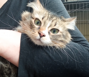 Muffinil oli oma kodu ja oma pere, kuid kassil olid probleemid agressiivsusega, ta oli korduvalt pereliikmeid rünnaud. Muffiniga käidi arsti juures, tervis on tal korras ja määrati talle rahustid, mis mingi periood toimisid aga siis läks ikka kõik vanaviisi edasi. Arsti juures soovitati veel pöörduda käitumisspetsialisti poole, aga sinna ei jõutud, kass toodi Pesaleidjasse 26 märtsil. Meie juures on Muffin hetkel igati sõbralik olnud, küsib pai ja tahab tähelepanu. Sülle võtmine on ka täitsa okei ja nurrub iga silituse peale. eks talle tuleb aega anda ja siis näeme kuidas ta edaspidi inimestesse suhtub. Muffin on umbes 4-aastane imeilus kassike kelle keha katab kohev ja pehme kasukas ja kes vaatab unistavalt oma suurte roheliste silmadega inimest ja üritab aru saada miks teda ei taheta. Tulevane kodu peab arvestama, et kuigi hetkel Muffin ei ole absoluutselt agressiivne siis võivad tal tekkida hood kus ta näitab oma metsikut poolt. Samuti on võimalik, et eelnev kodu ei olnud Muffinile sobilik ja oli miski mis ajas teda niimoodi käituma ning tegelt ongi ta üks suur nunnupall, kes niisama inimestele liiga teha ei taha. Kui kodus peaks Muffiniga probleemid tekkima siis on mitmeid variante mida tasub proovida, et kassi rahustada. Soetada omale Feliway, anda kassile Royal Canini Calm toitu ja osta kassidele mõeldud rahustavaid, looduslikke toidulisandeid.