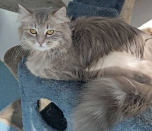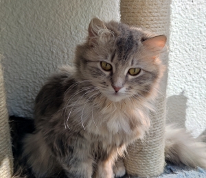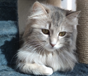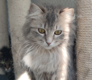 See emane kiisu võlub igaühe oma meeletult ilusa helehalli pika karva ja ilmekate silmadega. Tal on pikad vurrud, karvased põsekesed ja kohev saba. Hetkel ta veel paikätt kardab, aga mänguasjad pakuvad talle huvi ja ta jälgib suure uudishimuga, mis ta ümber toimub. Teiste kassidega on ta malbe ja tagasihoidlik, tüli ei nori ja hoiab pigem end jalust ära.